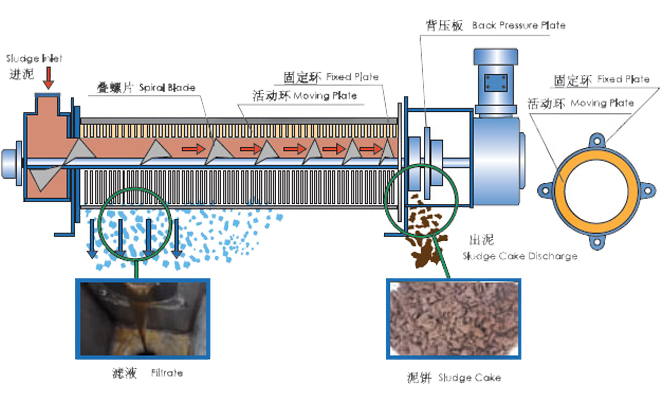 设备运行时,污泥从进料口进入滤筒后受到螺旋叶片的推送向卸料口移动,由于螺旋轴叶的螺距逐渐缩小,因此污泥所受到的压力也随之不断增加,并在压力的作用下开始脱水,水从固定环与游动环的间隙流出,同时设备依靠固定环也游动环之间的自清洗功能,清扫过滤间隙不易堵塞,泥饼经过脱水后在螺旋轴的推进作用下从卸料口排出。