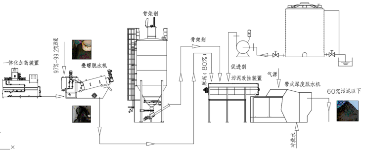 1)经过叠螺式污泥脱水机初级脱水,将含水率99%的污泥降至含水率75%-85%。